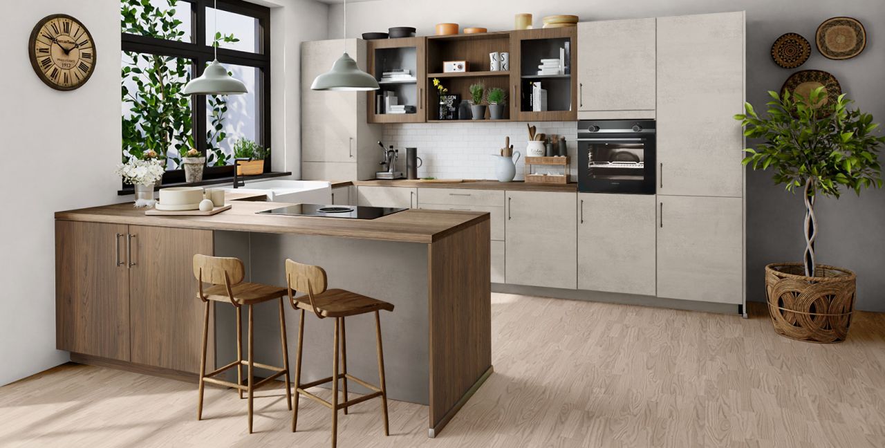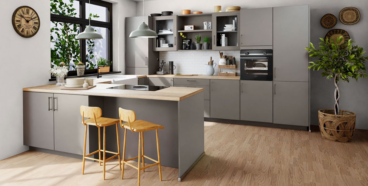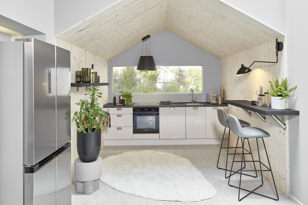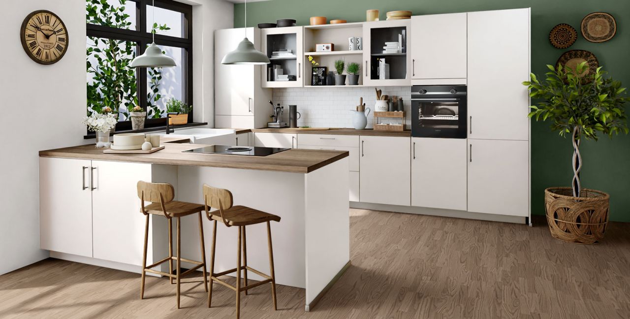 Inklusive Einbaubackofen AEG EB32B Energieeffizienzklasse A, Glaskeramik Kochfeld AEG EK60RX, Kühlschrank AEG EKS123E Energieeffizienzklasse E, Einbau-Designspüle Schock Kallio M175, XL-Schränken, Unterschrank mit Großraumauszügen, Wandschrankregal, Esstheke. Inklusive Lieferung.